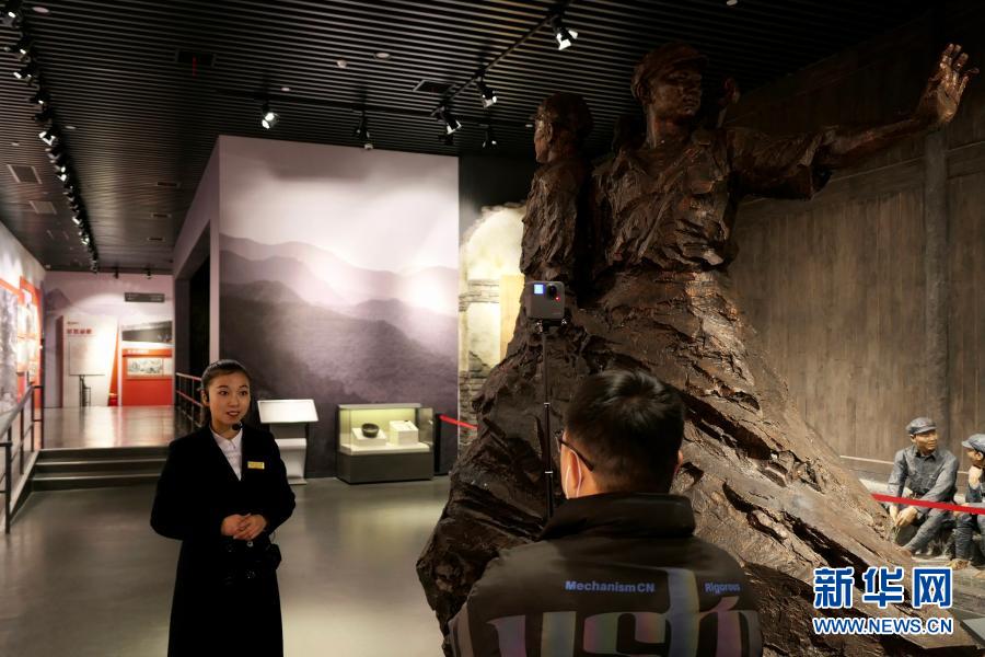 1月26日,在中国工农红军第二方面军长征出发地纪念馆,讲解员(左)在介绍一尊雕像,雕像中的三位红军都是独臂,红二方面军出了三位“独臂开国将军”——贺炳炎、余秋里、晏福生。新华社记者苏晓洲摄