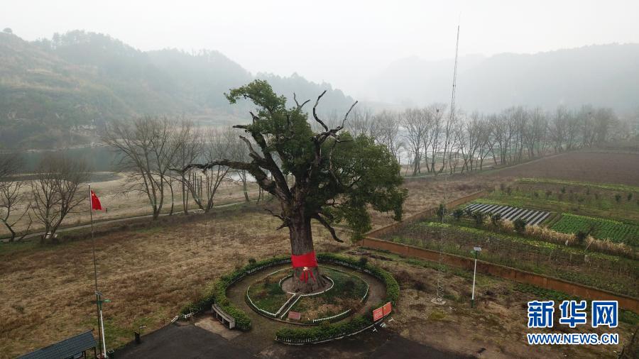 这是1月28日在湖南省张家界市慈利县溪口镇樟树村拍摄的“红军树”(无人机照片)。新华社记者陈振海摄