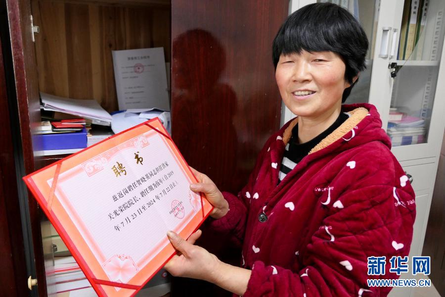 1月26日,湖南省张家界市桑植县洪家关光荣院院长贺晓英展示“返聘证书”。30多年来,贺晓英服务过100多位革命老人。新华社记者苏晓洲摄