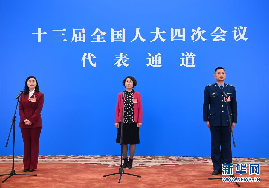 3月5日,第十三届全国人民代表大会第四次会议举行首场“代表通道”采访活动。这是全国人大代表袁晶、郭艳玲、余海龙(从左至右)通过网络视频方式接受采访。新华社记者 金良快 摄