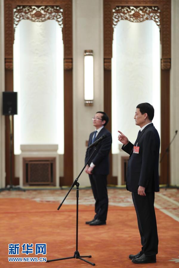 3月8日,第十三届全国人民代表大会第四次会议举行第二场“部长通道”采访活动。这是商务部部长王文涛(右)通过网络视频方式接受采访。