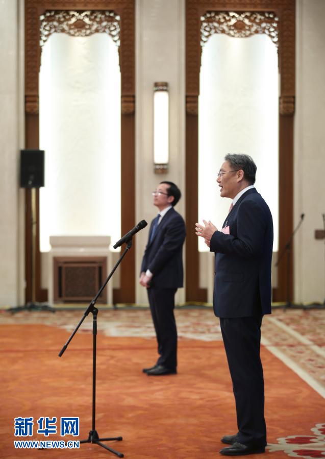 3月8日,第十三届全国人民代表大会第四次会议举行第二场“部长通道”采访活动。这是工业和信息化部部长肖亚庆(右)通过网络视频方式接受采访。