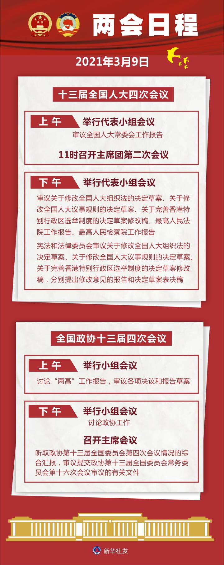 十三届全国人大四次会议9日上午举行代表小组会议,审议全国人大常委会工作报告;11时召开主席团第二次会议。下午举行代表小组会议,审议关于修改全国人大组织法的决定草案、关于修改全国人大议事规则的决定草案、关于完善香港特别行政区选举制度的决定草案修改稿、最高人民法院工作报告、最高人民检察院工作报告;宪法和法律委员会审议关于修改全国人大组织法的决定草案、关于修改全国人大议事规则的决定草案、关于完善香港特别行政区选举制度的决定草案修改稿,分别提出修改意见的报告和决定草案表决稿。