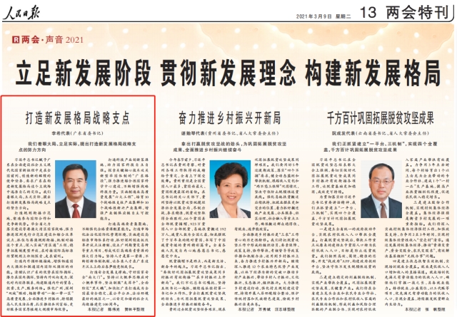 人民日报2021年3月9日讯 3月9日,《人民日报》“两会·声音2021”专栏刊发全国人大代表、广东省委书记李希署名文章《打造新发展格局战略支点》。