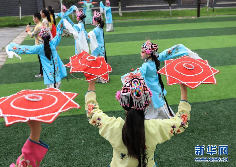 2020年7月31日,陕西省汉中市洋县城西小学戏剧社团的孩子们利用暑假在校园排练秦腔《春满洋州》。新华社记者兰红光摄