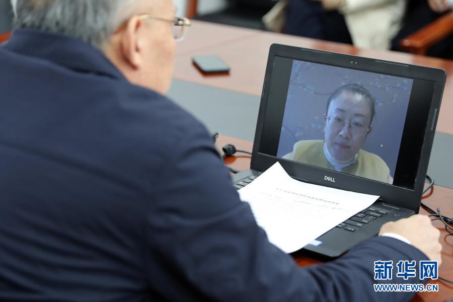 3月10日,全国政协十三届四次会议在北京人民大会堂新闻发布厅举行第三场“委员通道”采访活动。这是记者(屏幕中手持话筒者)通过网络视频方式提问。新华社记者王南摄