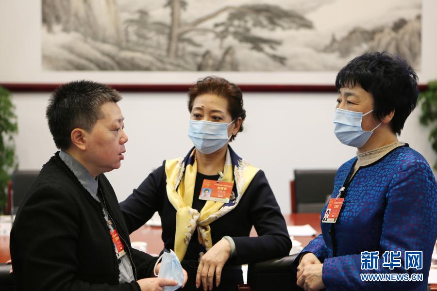 3月6日,十三届全国人大四次会议天津代表团的孔晓艳代表(左)、关牧村代表(中)和马杰代表在会议间隙交流讨论。新华社记者吴雨摄