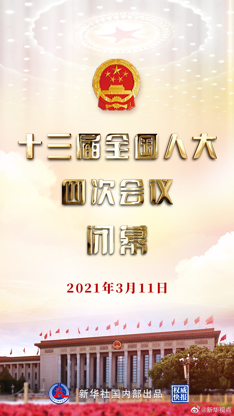 新华社“新华视点”微博2021年3月11日讯 十三届全国人大四次会议11日闭幕,大会批准政府工作报告、批准“十四五”规划和2035年远景目标纲要、通过关于修改全国人大组织法的决定、通过关于修改全国人大议事规则的决定、通过关于完善香港特别行政区选举制度的决定、批准关于2020年国民经济和社会发展计划执行情况与2021年国民经济和社会发展计划草案的报告、批准2021年国民经济和社会发展计划、批准关于2020年中央和地方预算执行情况与2021年中央和地方预算草案的报告、批准2021年中央预算、批准全国人大常委会工作报告、批准最高人民法院工作报告、批准最高人民检察院工作报告。