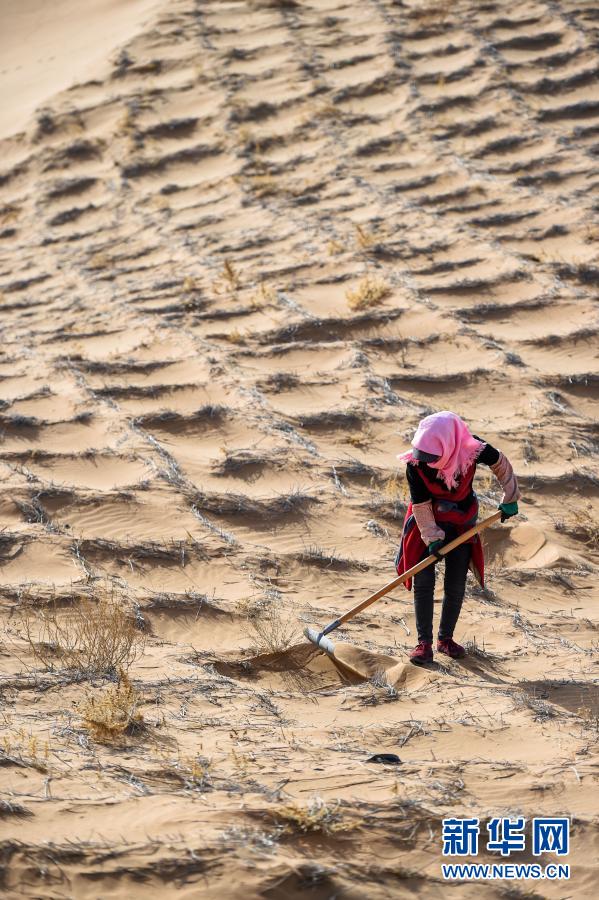2020年4月2日,工人在阿拉善左旗腾格里沙漠种植花棒。新华社记者连振摄