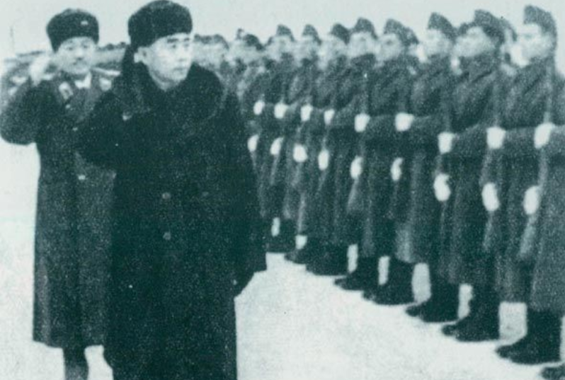 1957年1月16日,周恩来、贺龙检阅匈牙利人民军仪仗队。
