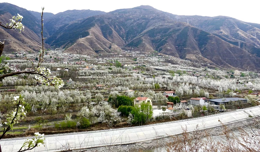 梨花点缀在山坡上,绵延百余公里,像一条洁白的哈达,把大金川河装扮得雍容华贵。李仁奇 摄