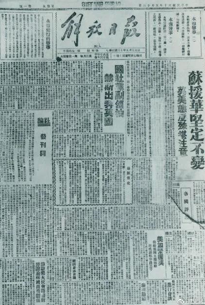 图为1941年5月16日在延安创刊的中共中央机关报《解放日报》。