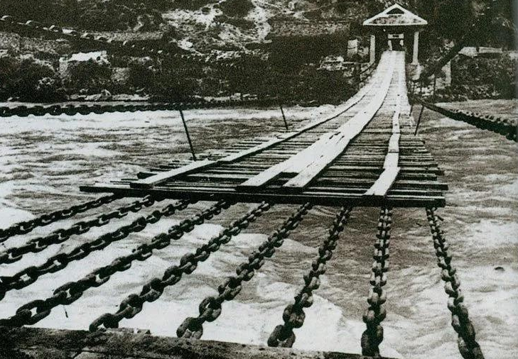 1935年5月29日,中央红军左纵队先头部队在泸定桥西头发起夺桥战斗,胜利抢占大桥。图为泸定桥。