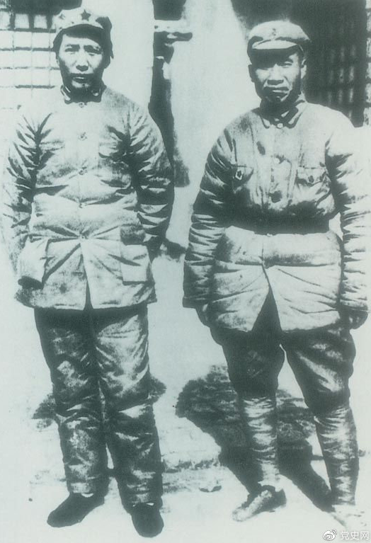 1937年7月7日,卢沟桥事变爆发。8日,中共中央通电全国,号召结成民族统一战线抵抗日本侵略者。图为1936年冬毛泽东和朱德在陕北。