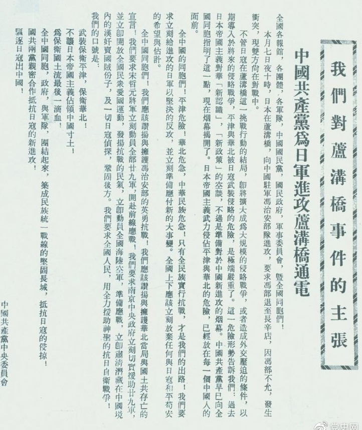 1937年7月8日,中共中央向全国发出《中国共产党为日军进攻卢沟桥通电》,号召全国同胞奋起抗战。