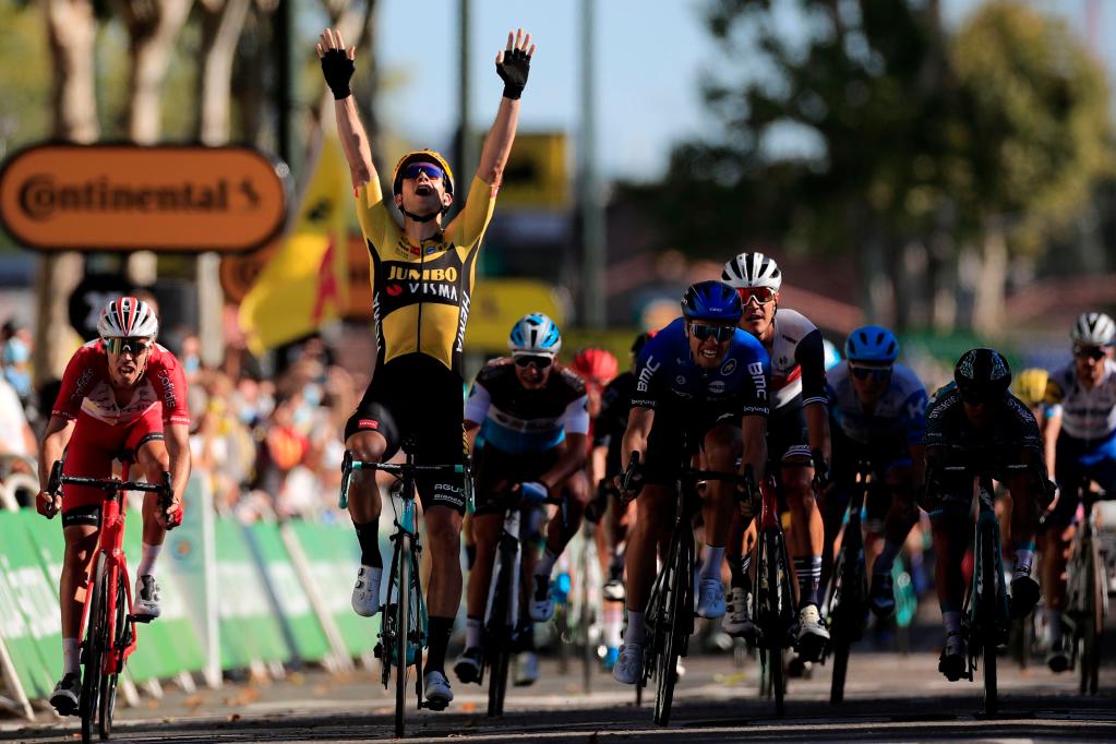 资料图:2020环法自行车赛中,比利时车手范阿尔特(左二)率先冲过终点线后庆祝。新华社/法新