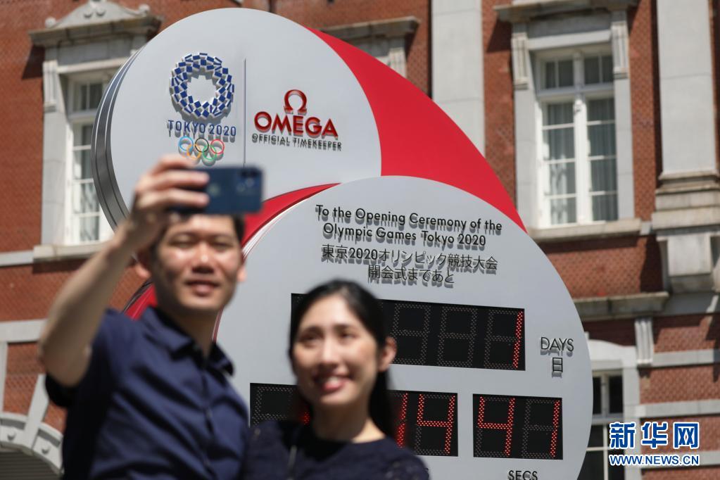 7月22日,人们在东京车站前的广场上与东京奥运会倒计时电子时钟合影。