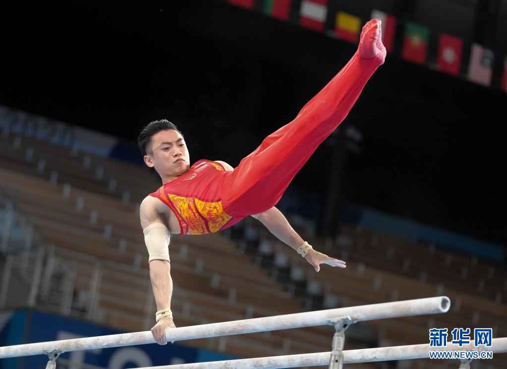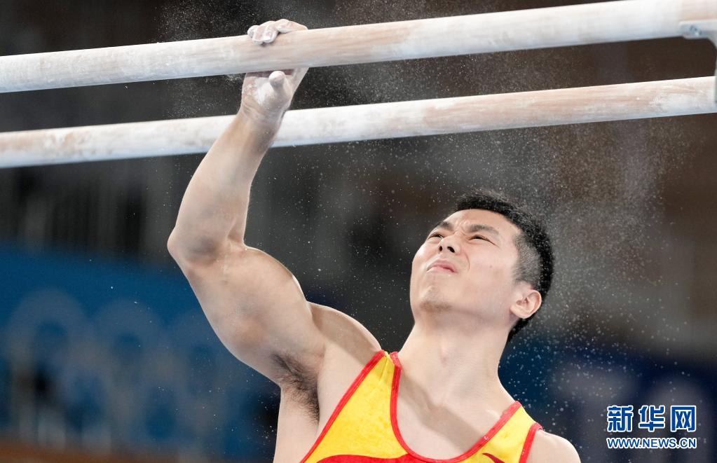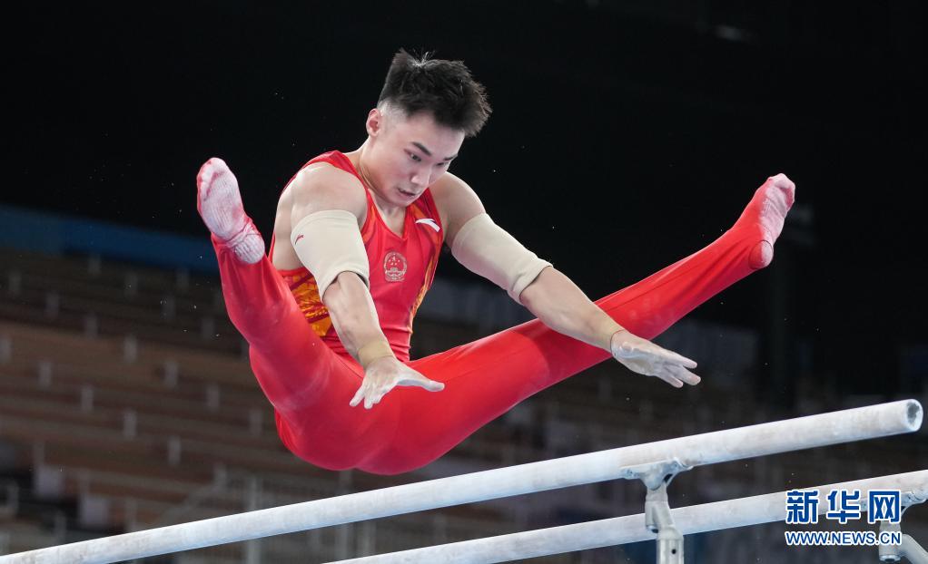 7月21日,中国运动员尤浩在双杠项目训练中。