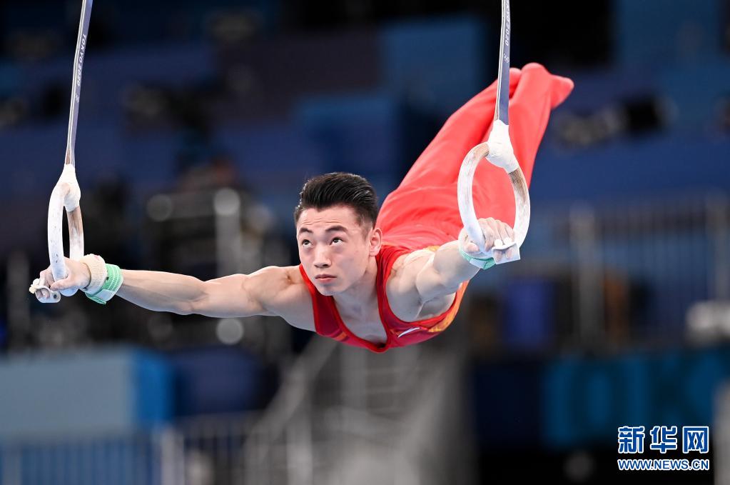7月21日,中国运动员邹敬园进行吊环项目训练。