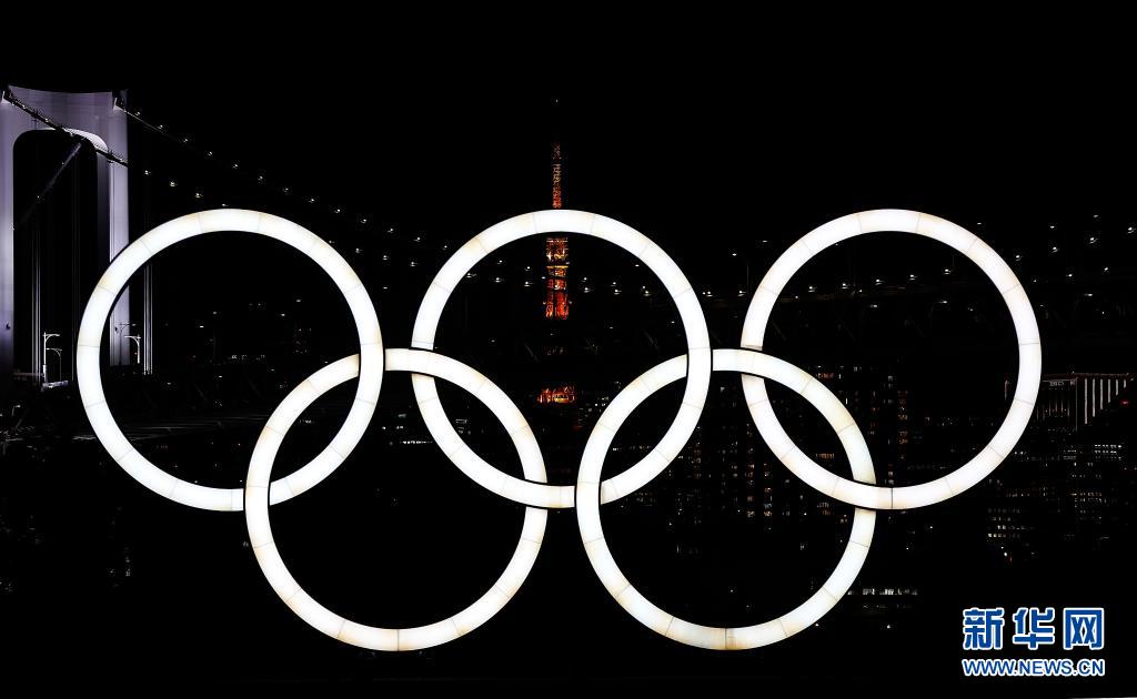 7月21日,位于东京湾的奥运五环标志被点亮。