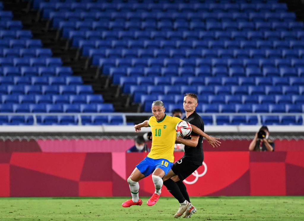 新华社东京7月22日电(记者林昊、岳冉冉)东京奥运会男足小组赛22日展开首轮争夺,巴西队凭借前锋理查利森的帽子戏法4:2击败德国队。当天也出现了多场冷门,法国队和阿根廷队遭遇完败,夺冠热门西班牙队被逼平,东道主日本队则艰难收获开门红。
