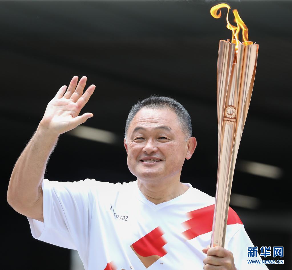 7月23日,日本奥委会主席山下泰裕作为火炬手在仪式现场挥手。