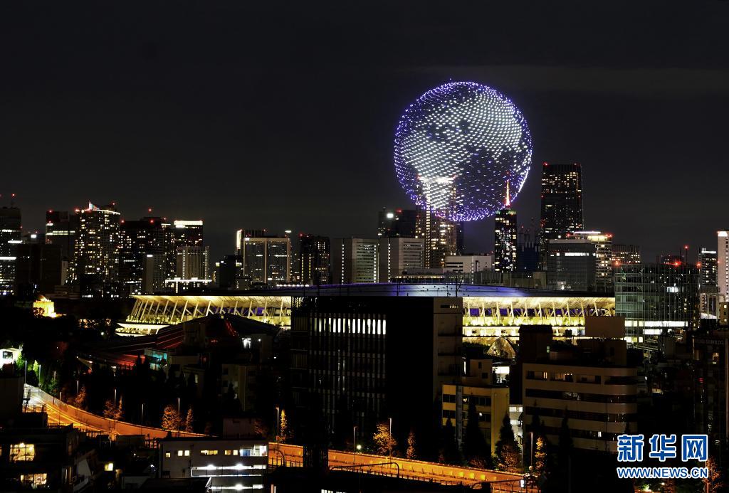 这是7月23日拍摄的开幕式期间新国立竞技场上空的无人机表演。