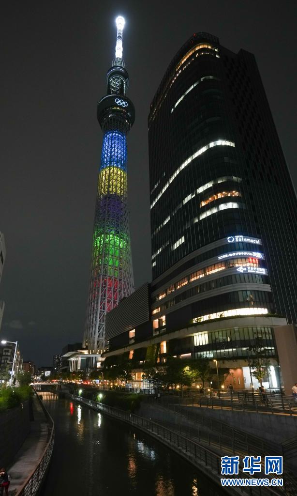 当晚,东京晴空塔亮起的五色灯光,与奥运遥相呼应,为参赛运动员加油。
