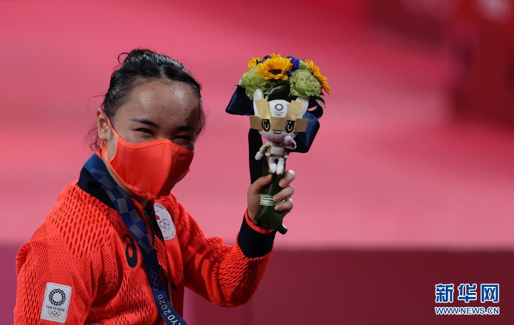 7月26日,日本队选手伊藤美诚与队友水谷隼赢得乒乓球混双冠军后登上领奖台。