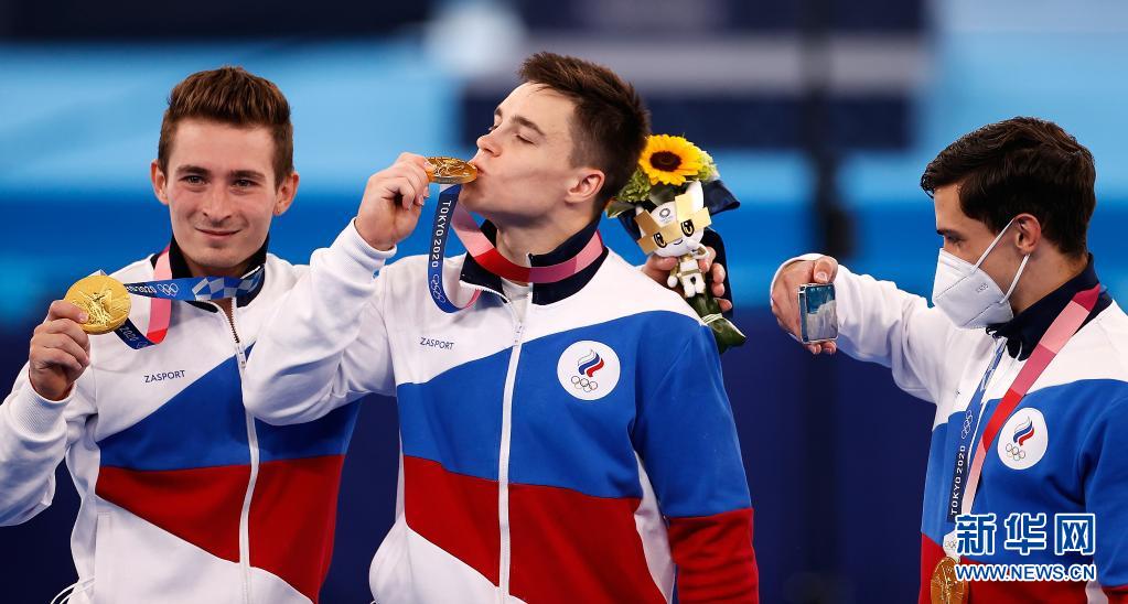 7月26日,俄罗斯选手纳戈尔内(中)、别利亚夫斯基(左)和达拉洛扬赢得体操男子团体冠军后登上领奖台。