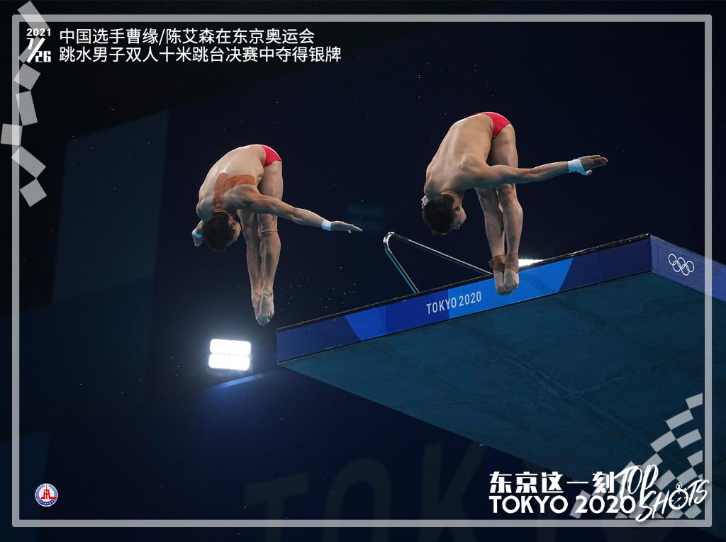 7月26日,中国选手曹缘/陈艾森在东京奥运会跳水项目男子双人十米跳台决赛中。