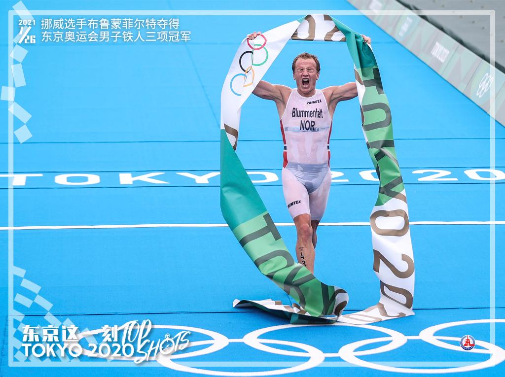 7月26日,挪威选手布鲁门菲尔特在铁人三项比赛冲线后庆祝。