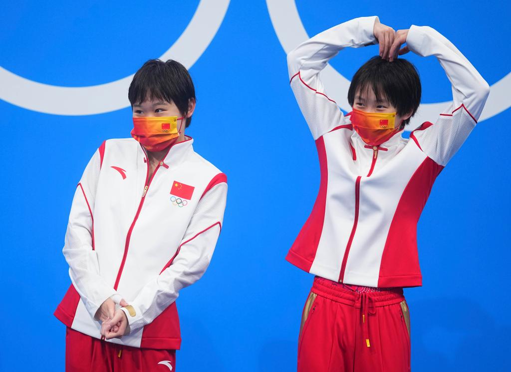 7月27日,中国选手陈芋汐(右)和张家齐在东京奥运会跳水女子双人十米跳台决赛中夺得冠军。新华社记者许畅摄