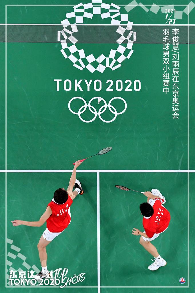 7月27日,中国选手李俊慧(左)/刘雨辰在东京奥运会羽毛球男双小组赛中。