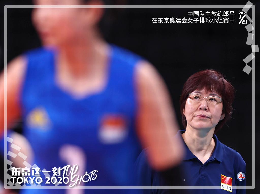 7月27日,中国队主教练郎平在东京奥运会女子排球小组赛对阵美国队的比赛中。