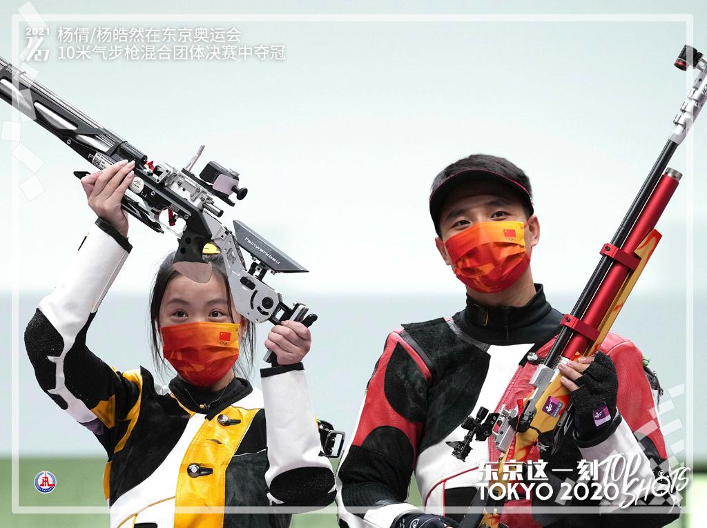7月27日,杨倩(左)/杨皓然夺得东京奥运会10米气步枪混合团体决赛冠军。