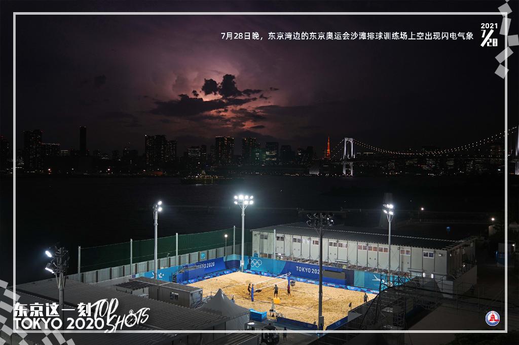 7月28日晚,东京湾边的东京奥运会沙滩排球训练场上空出现闪电气象。