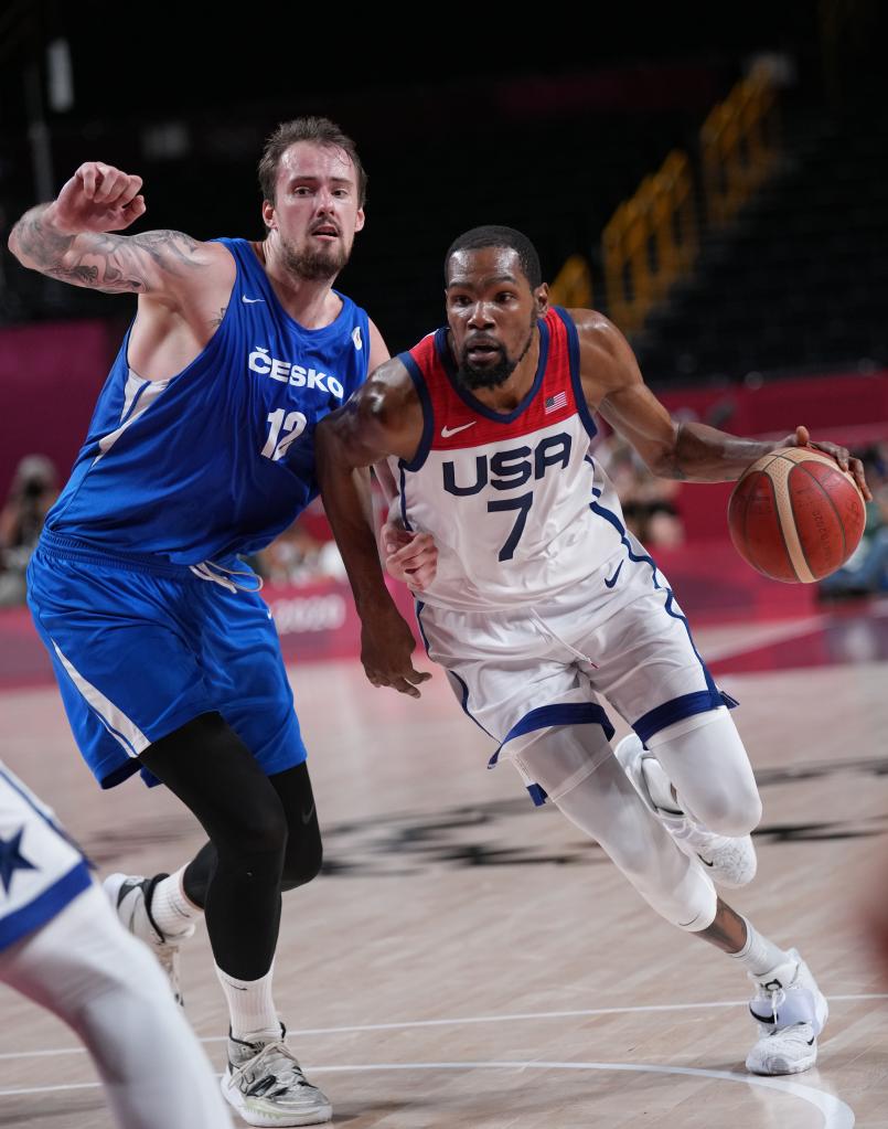 7月31日,美国队球员杜兰特(右)在比赛中突破。新华社记者孟永民摄