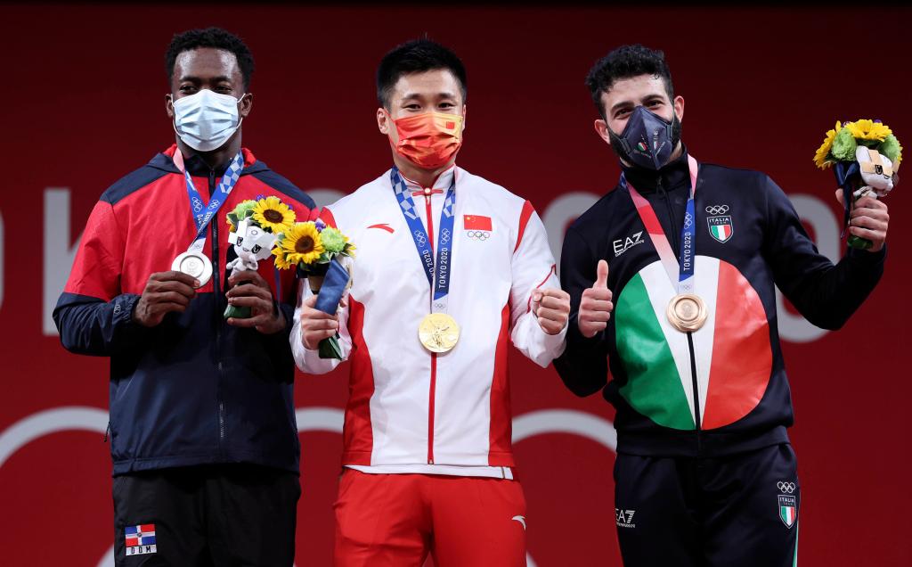 7月31日,冠军中国选手吕小军(中),亚军多米尼加选手米歇尔(左)和季军意大利选手皮佐拉托在颁奖仪式上。新华社记者杨磊摄