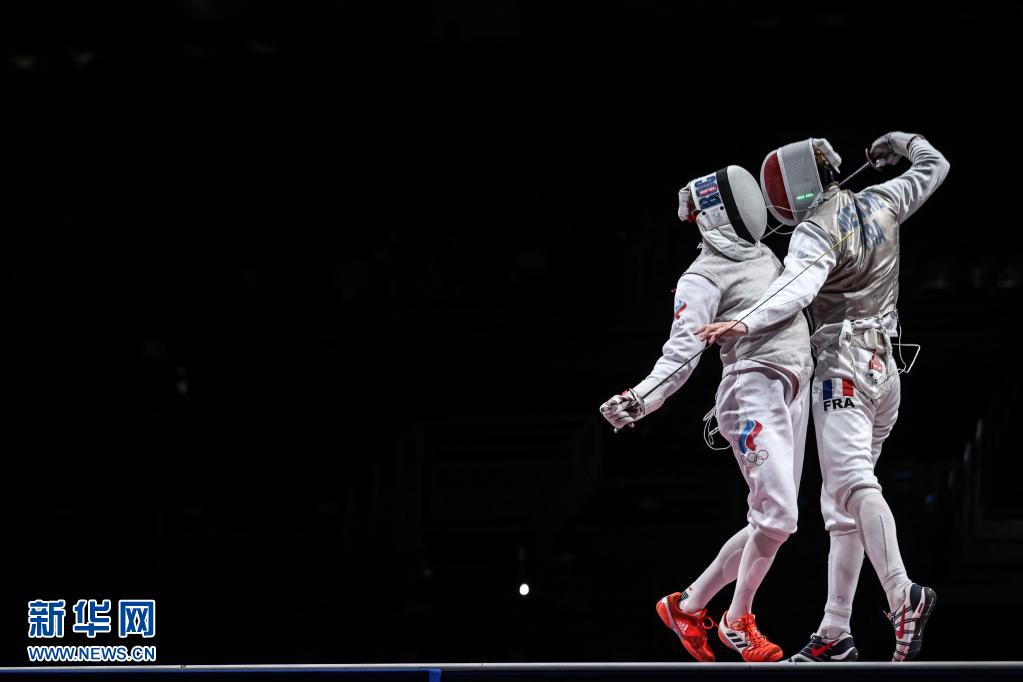 8月1日,法国队选手梅廷(右)与俄罗斯运动员博罗达切夫在击剑项目男子花剑团体金牌争夺战中。