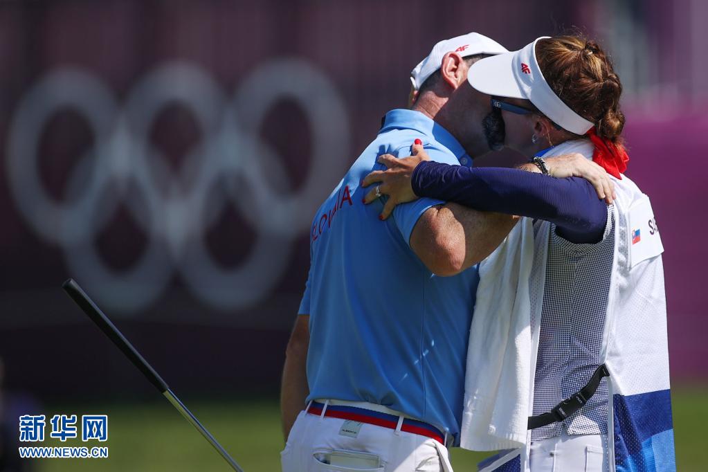 8月1日,斯洛伐克选手萨巴蒂尼(左)在赛后与兼任球童的妻子相吻庆祝。