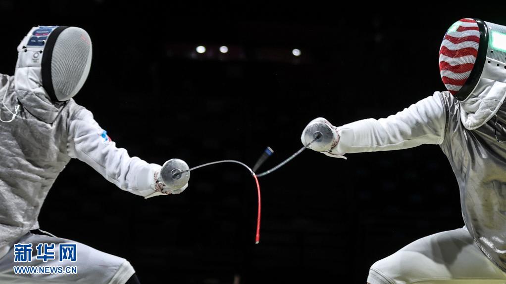 8月1日,美国队选手迈因哈特(右)与俄罗斯运动员梅利尼科夫在击剑项目男子花剑团体赛半决赛中。