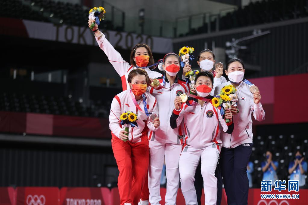 8月2日,冠军印度尼西亚组合波莉/拉哈尤、亚军中国组合陈清晨/贾一凡、季军韩国组合金昭映/孔熙容在颁奖仪式上。
