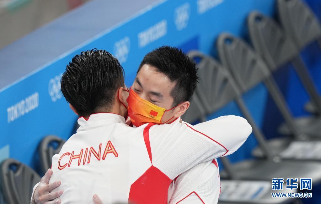 8月2日,尤浩(右)和队友刘洋在赛后拥抱。
