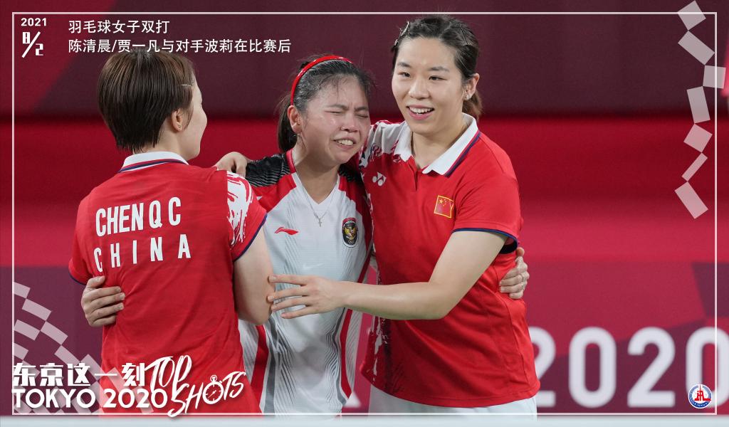 8月2日,在东京奥运会羽毛球女双决赛后,获得亚军的中国组合陈清晨(左)/贾一凡(右)与获得冠军的冠军印度尼西亚组合之一波莉在一起。