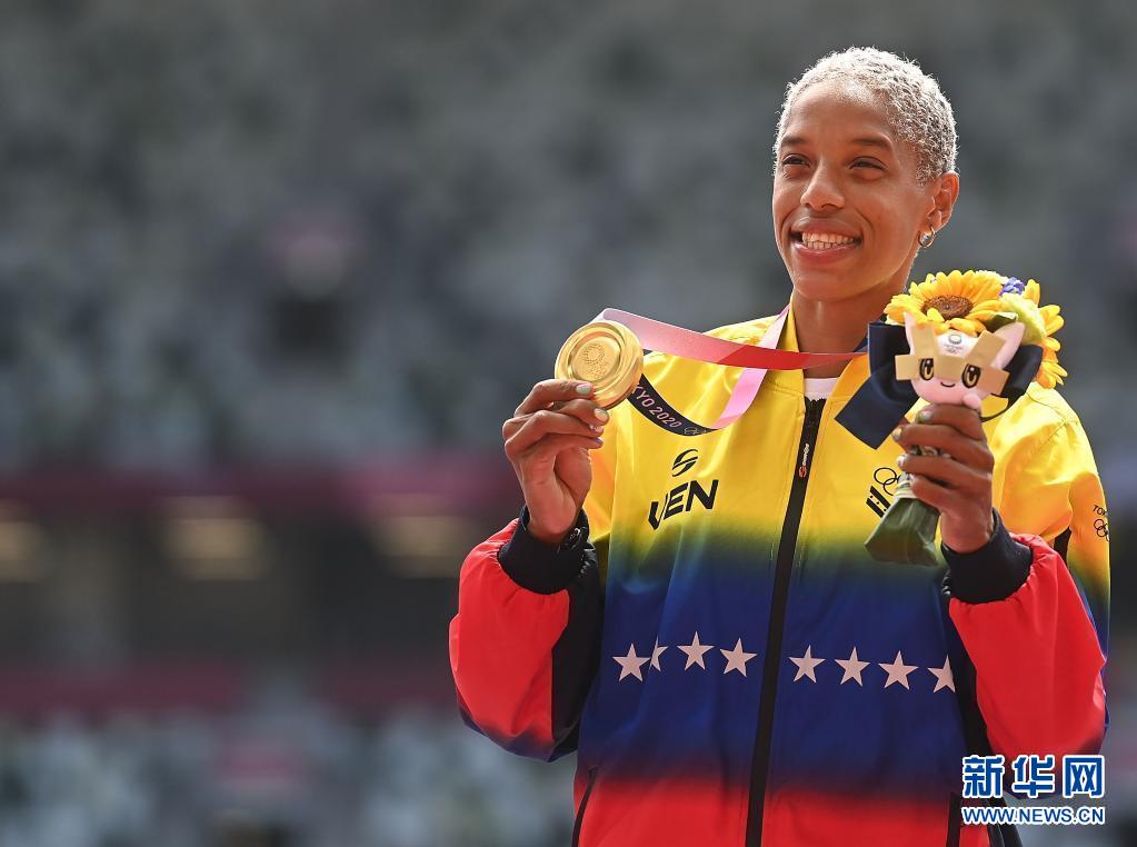 8月2日,委内瑞拉选手尤利马尔·罗哈斯在女子三级跳远颁奖仪式上。
