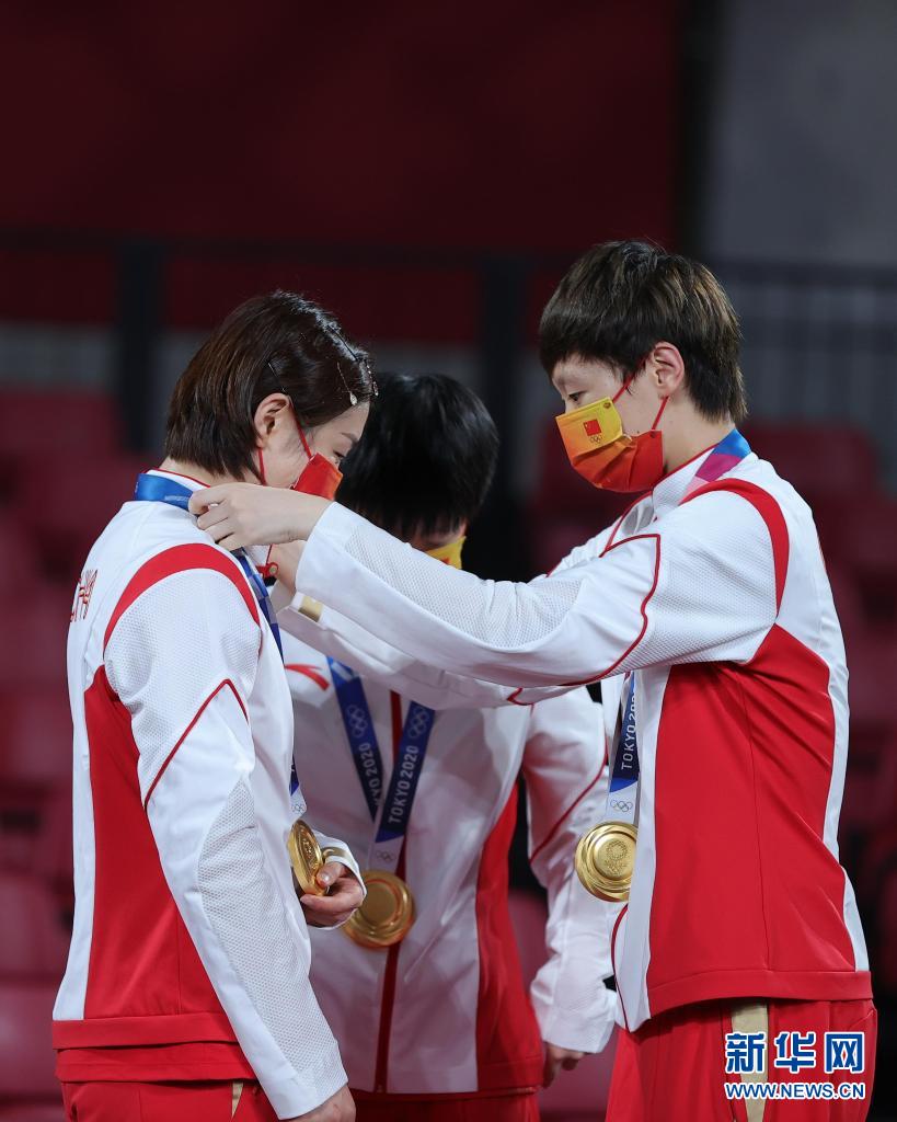 当日,在东京奥运会乒乓球女子团体决赛中,中国队战胜日本队,夺得冠军。