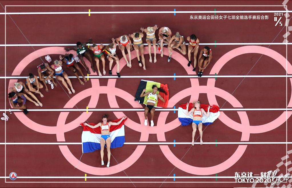 8月5日,东京奥运会田径女子七项全能选手赛后合影。