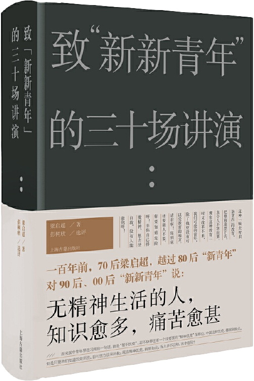 这本《致“新新青年”的三十场讲演》编选了梁启超从1914年至1927间的30篇演讲,每一讲都关于教育和青年问题。虽说梁启超的演说与今天隔了将近一百年的时间,但年轻人关于未来的道路,关于前途和人生的困惑,总是相同的。读此书,不仅可以听到梁启超诚挚的声音,更可以感到那个向上的,充满朝气的时代。