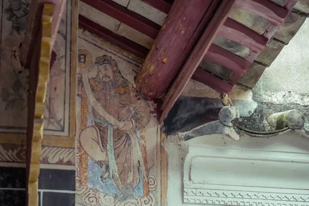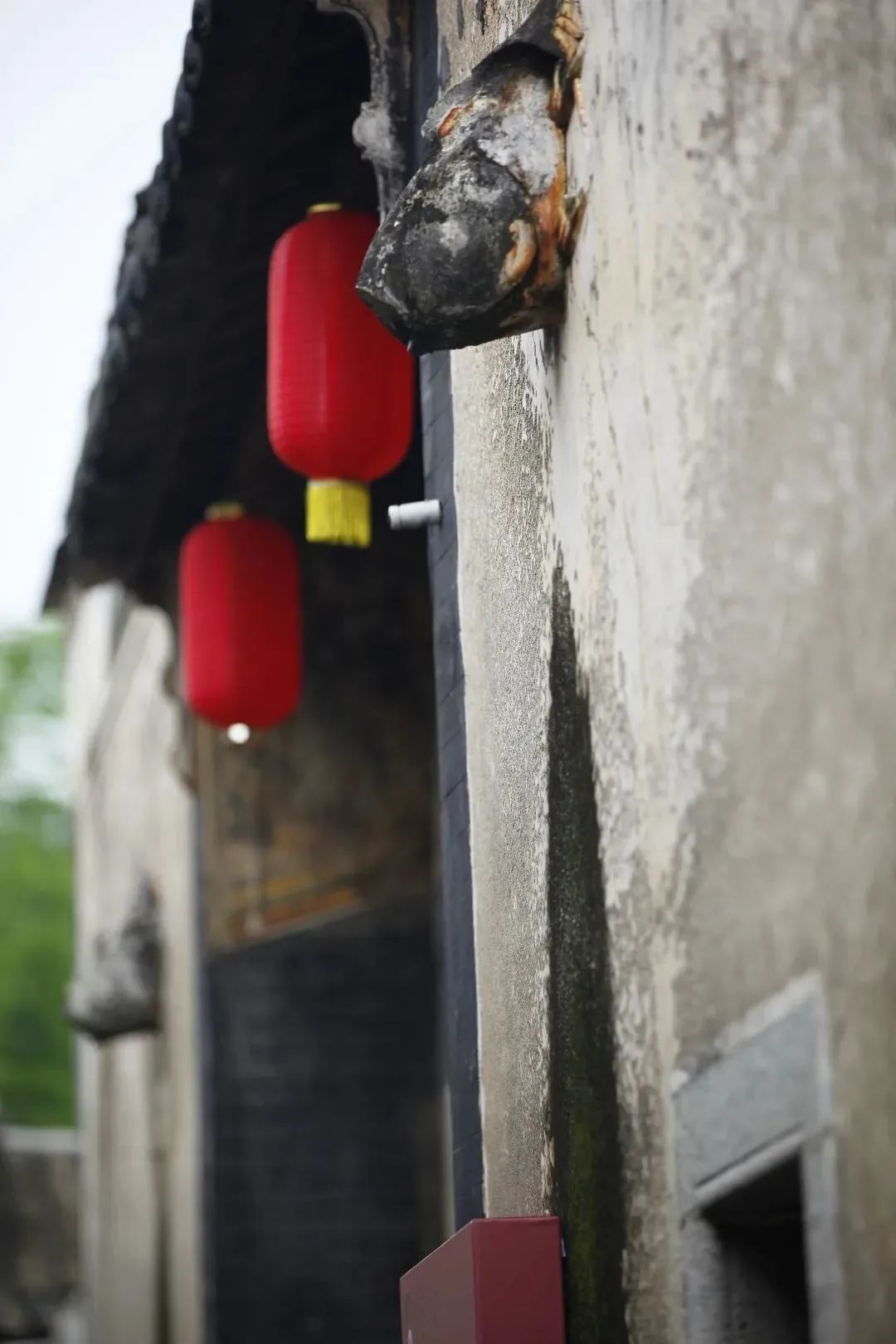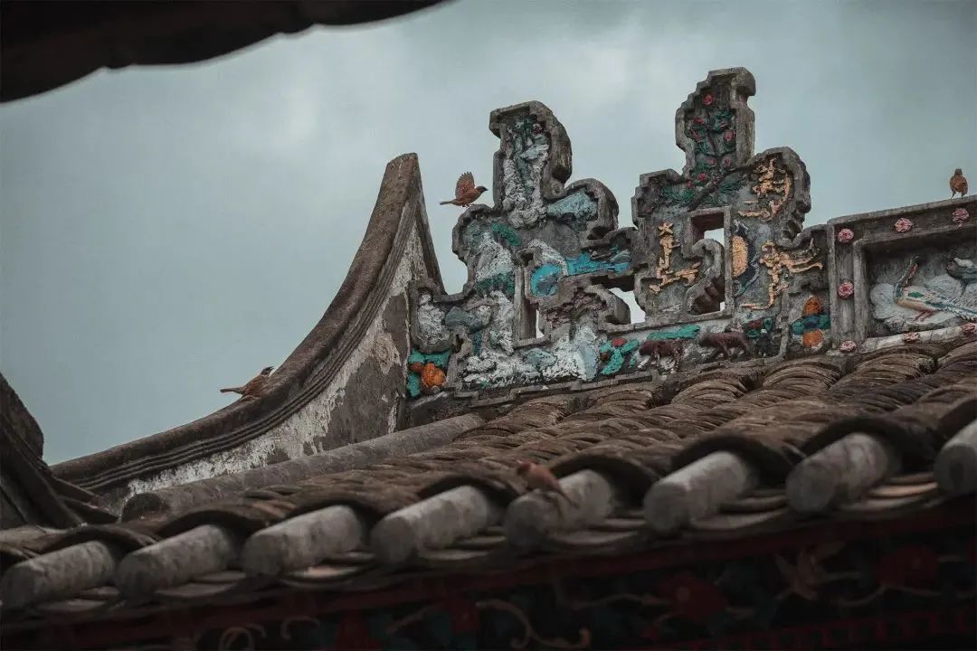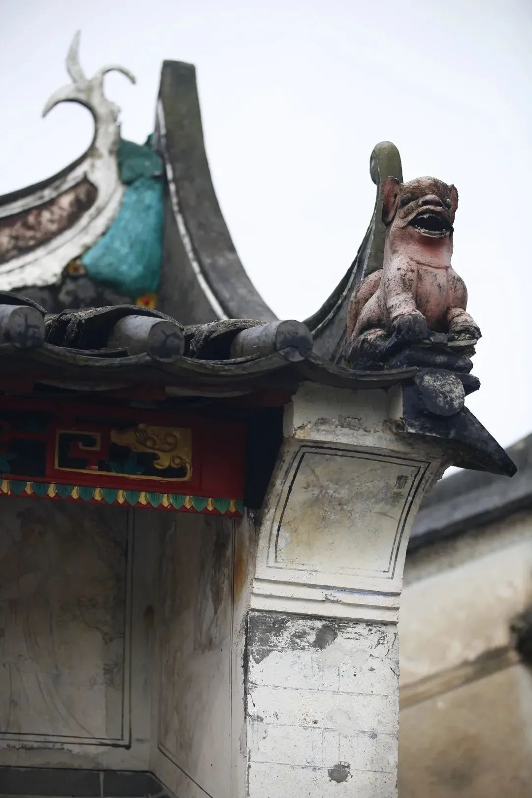 正门门墙上灰塑红梅瑞鸟,屋脊为博古脊,一进和三进正脊两端灰塑夔龙纹,二进为龙船脊,既古朴又精致。